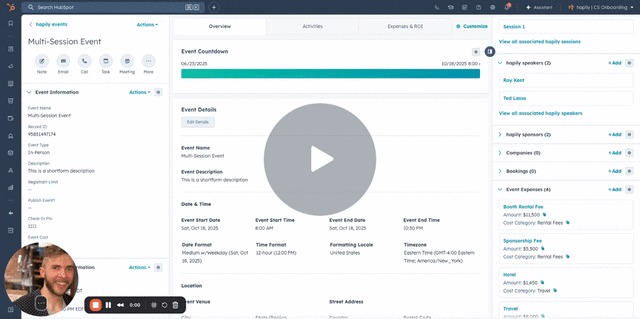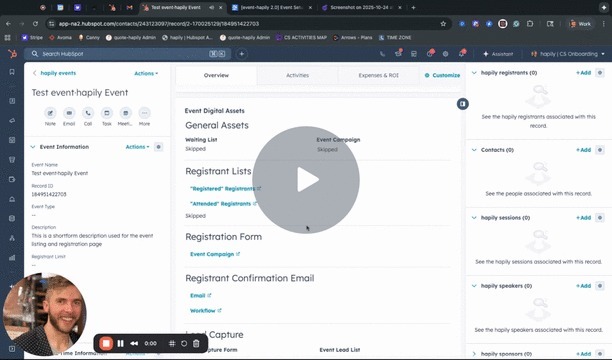 A hapily speaker is an instance where one of your HubSpot Contacts becomes a speaker for a hapily event. Each Contact will have an individual Speaker record for each Event he or she is speaking for (Same as a Registrant record).