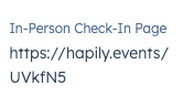An ‘In-Person check in page’ will be created automatically whenever an event is created. You can find this directly on your event record in HubSpot. Feel free to share this URL with any event staff (no HubSpot access required) to check in registrants for the event.