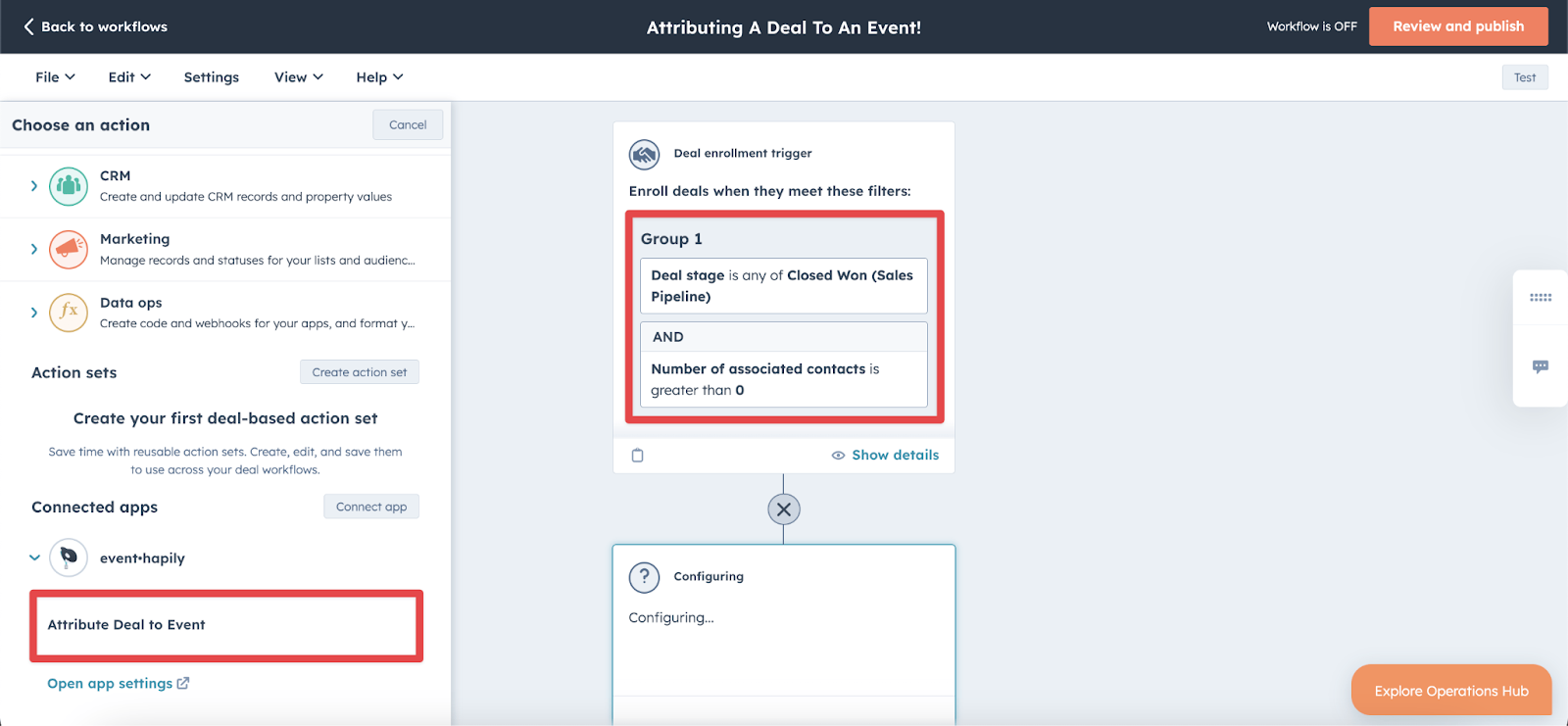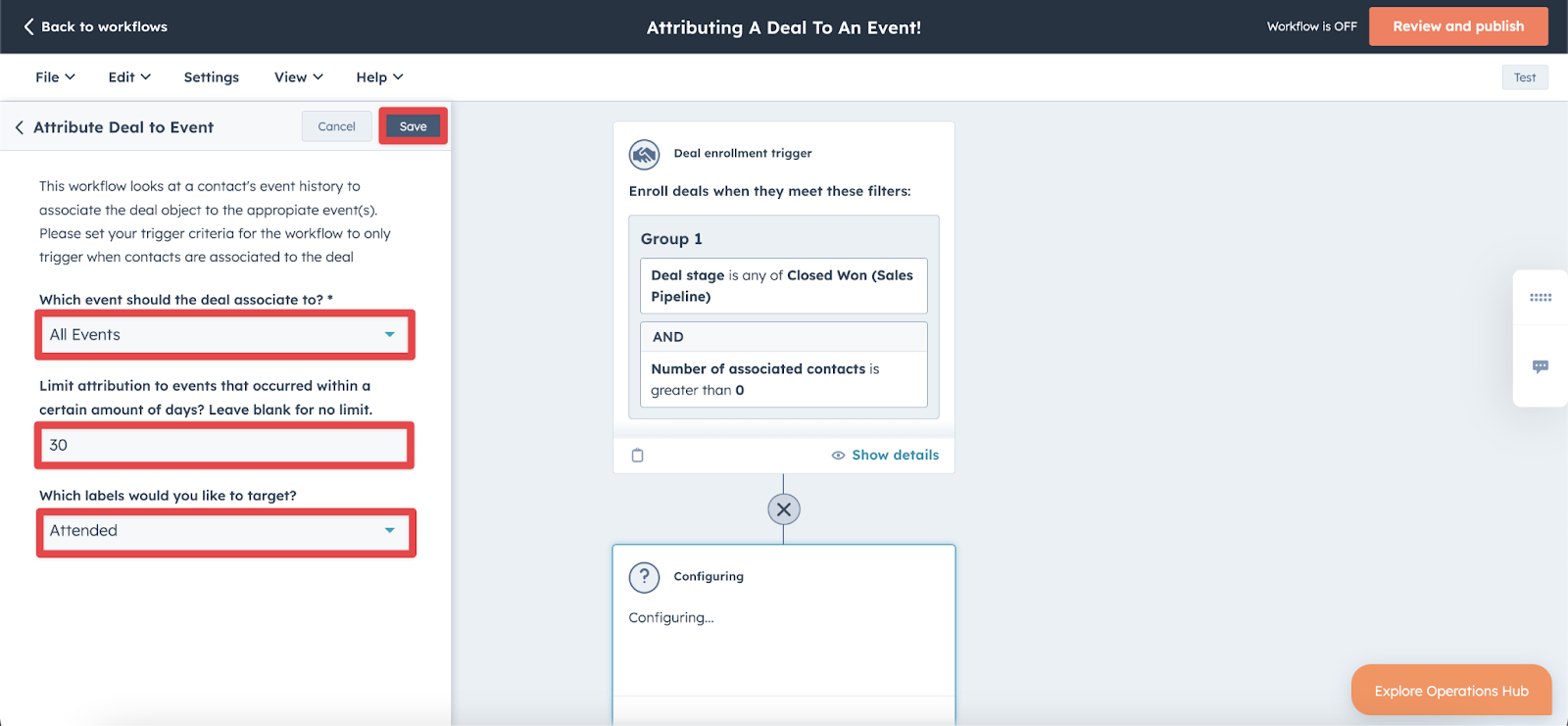 Let’s start by building a workflow to Attribute deals to the event/s based on that Contact to Event association.