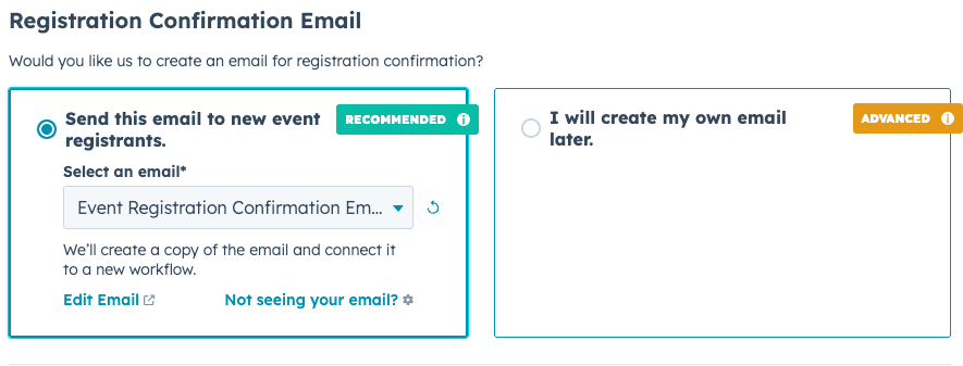 Hapily’s Event Builder can automatically create a registration confirmation email workflow for you by selecting the option to ‘Send this email to new event registrants’ which will clone the email you select from the dropdown and add it to a new workflow specific to this new event record.