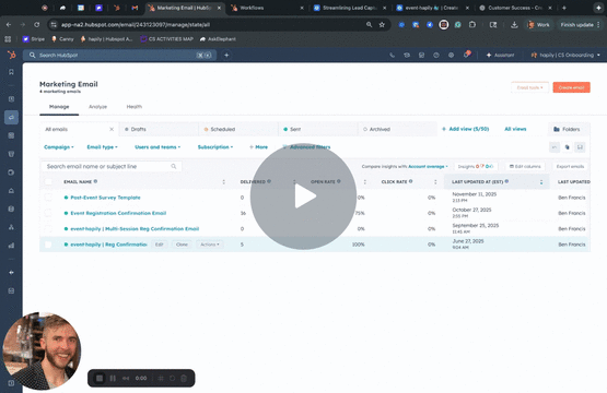 How to use the hapily registrant record in HubSpot to send dynamic emails like confirmation, reminders, and post-event surveys
