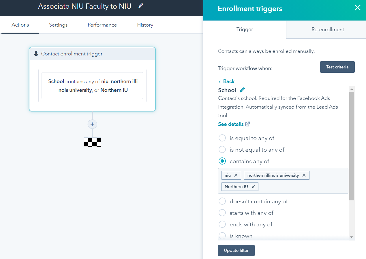 2. Since we know that the "School" property on the Contact is freeform, we'll make sure to include several known permutations of the school. In the Contact Enrollment Trigger, we'll select the School property and "contains any of" NIU, Northern Illinois University, or Northern IU.