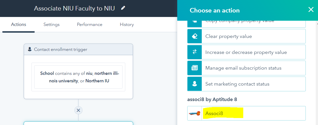 3. Click the "+" to add a new Action, then scroll down and select Associ8.