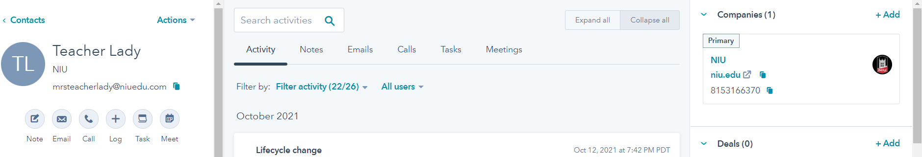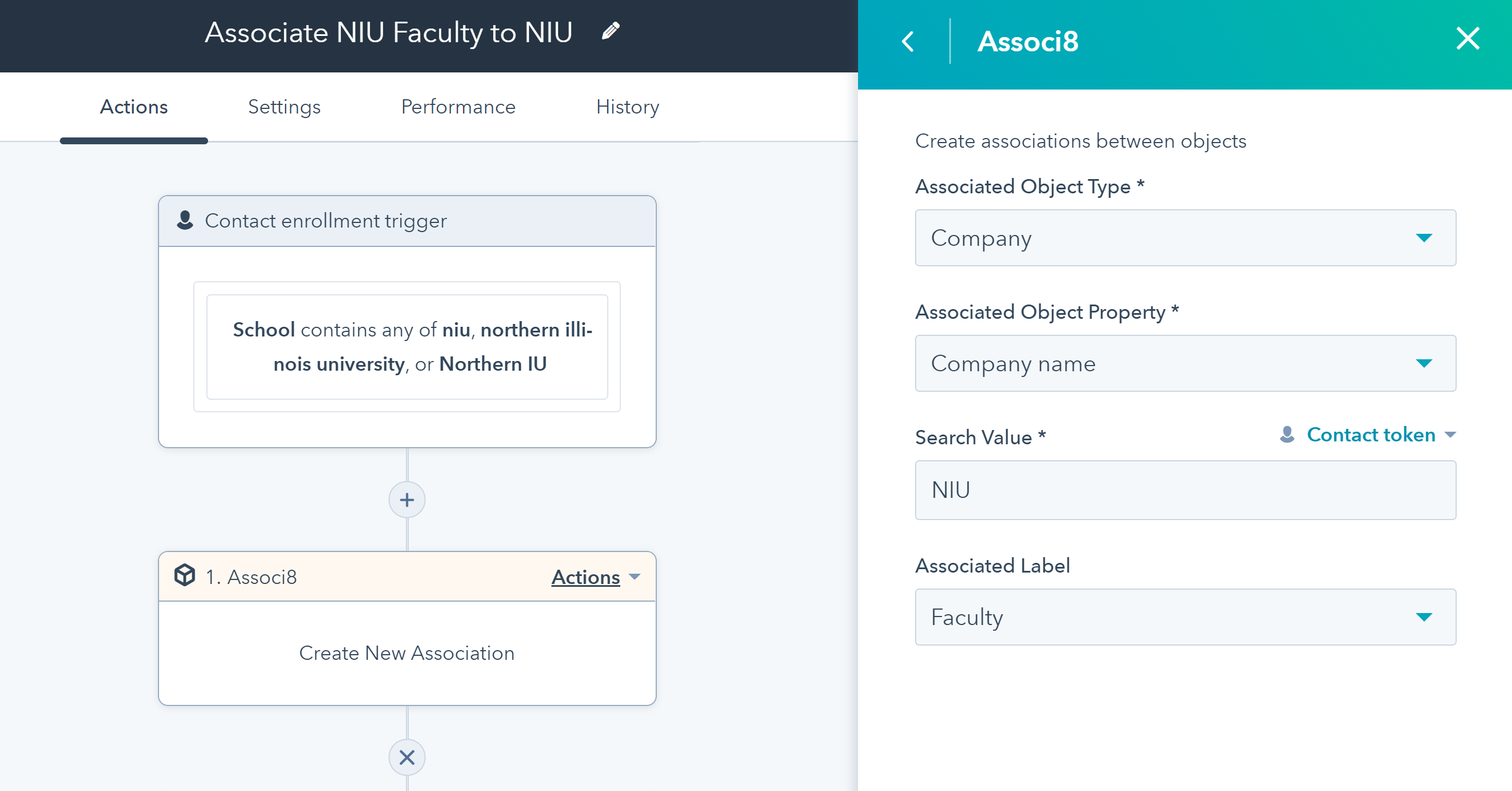 4. Now we're going to create the association. In our HubSpot, the company name for our school is NIU, so fill in the following values: