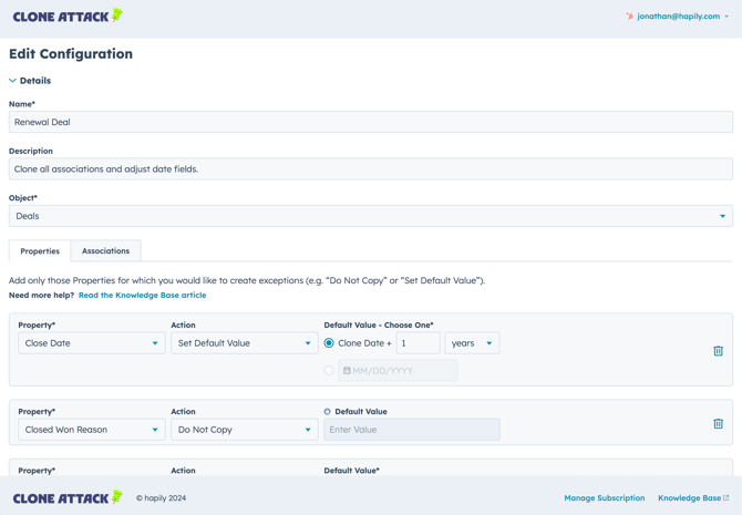 Clone Configurations let you to customize how HubSpot records are cloned, deciding what properties to clone and setting default field values for consistency.