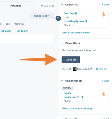 Clone Attack allows you to clone individual records directly from the object record view in HubSpot—no workflows required. This is useful for one-off scenarios like duplicating a Deal for a new project, recreating a Ticket from a previous support request, or spinning up a new Company record with the same properties and associations.