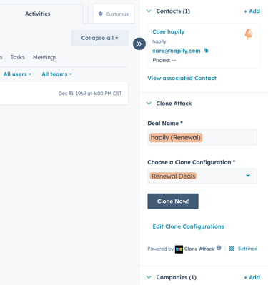 You just closed a deal and want to immediately create a copy in a “Renewals” pipeline. Instead of building a workflow, simply open the Deal and click Clone It! to create the clone instantly—using a pre-set Clone Configuration that routes it to the right pipeline and stage.