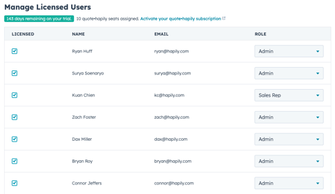 Only Admin users can access the quote•hapily Admin app, manage Quote Rules, Price Books, and User access.