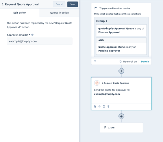- Multiple approvers can be added to the same action by using a comma separated list of emails Example: user1@hapily.com, user2@hapily.com). If multiple emails are added, only one of the approvers will need to approve the quote in order for the quote to complete this action and continue to the next action.