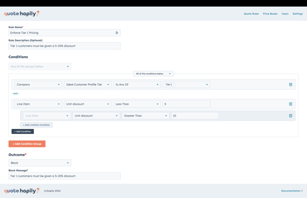 The rule will block any quote where a Tier 1 customer is given a discount less than 5% or greater than 10%, ensuring adherence to pricing policies.