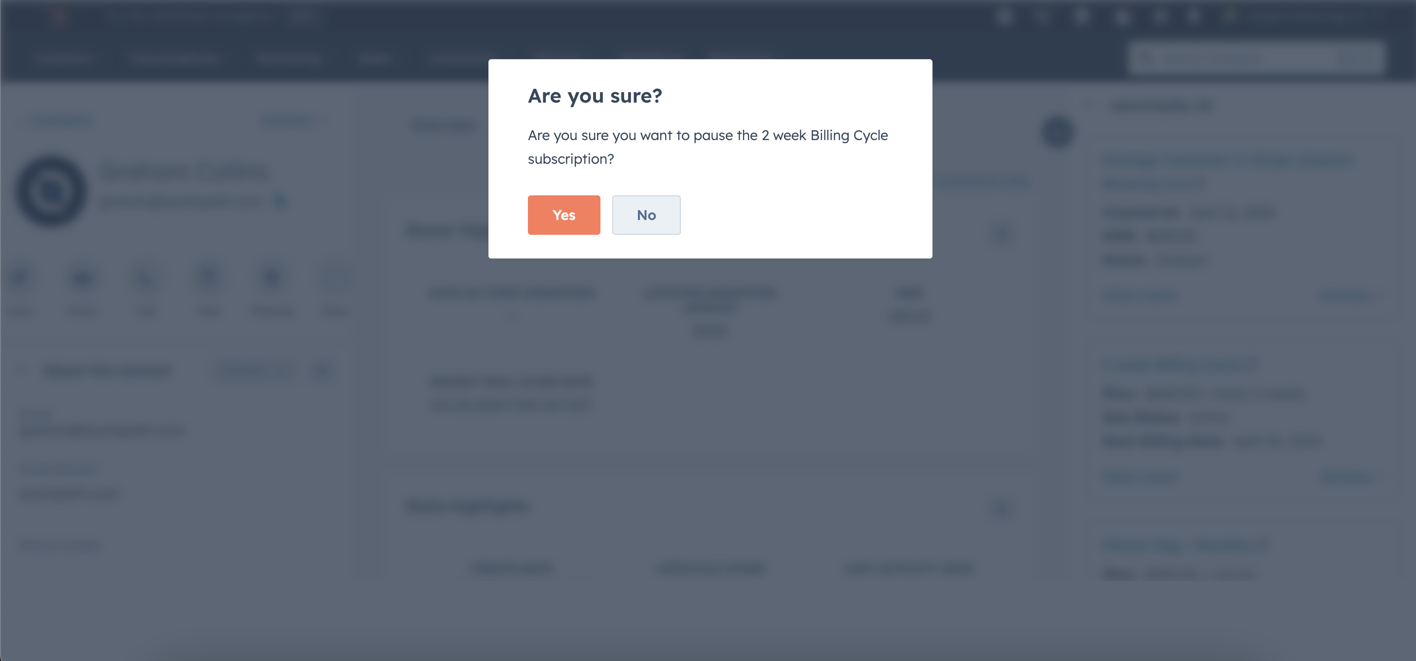 - Navigate to the HubSpot Contact you want to pause the Subscription for.