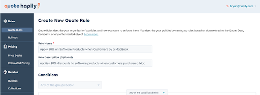 Go to the left-hand menu and click Rules > Quote Rules. Then click + Create Rule or edit an existing one.