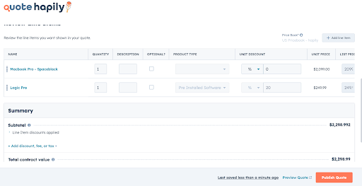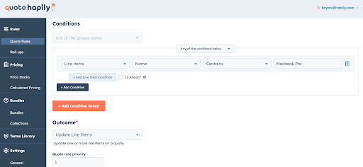 The Update Line Item Property feature in quote•hapily allows you to automatically change any product property on one or more quote line items when certain conditions are met. This can include things like applying a discount, delaying billing, controlling quantity, changing terms etc.