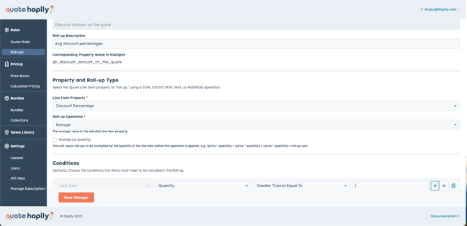 Roll-ups in quote•hapily help you automatically calculate values across all line items on a quote—like totals, averages, minimums, or maximums. Think of them as smart summaries. You choose a line item property (like Net Price or Discount Percentage), and the roll-up will gather that info from all the quote lines and save it at the quote level.