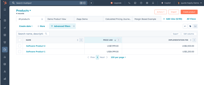 Roll-ups can also help calculate prices dynamically. For example, you can calculate an Implementation Fee based on a field like Total Implementation Fee and use a formula. In hubspot you might have products that have associated fee's and roll ups make it easy to present those fees as a product inside of a quote. Here is an example product library setup inside HubSpot: