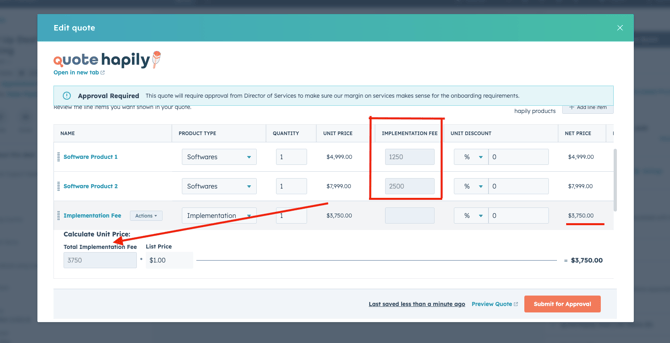 Now When reps add Software Products with their own implementation costs, this roll-up will total them up and auto-calculate the price for the Implementation Fee line item when its added to the quote: