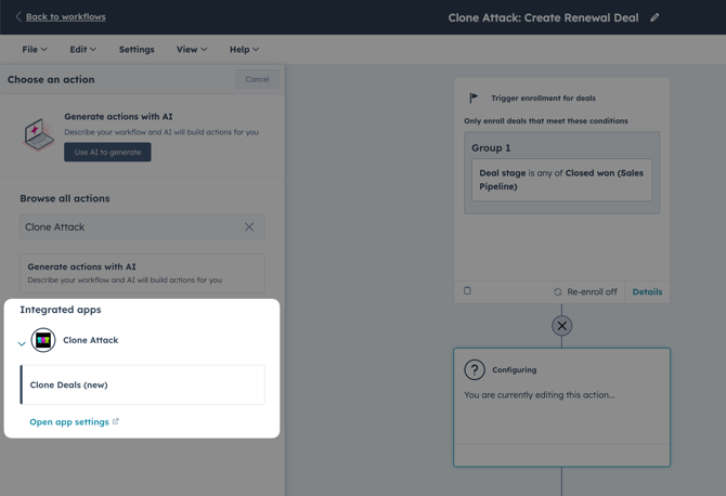The Clone Attack workflow action allows you to automate the cloning of Deals, Contacts, Companies, or Tickets based on your configured Clone Configuration. This is useful for workflows like automatically generating a renewal deal when a deal is marked "Closed Won", or duplicating records for onboarding processes.