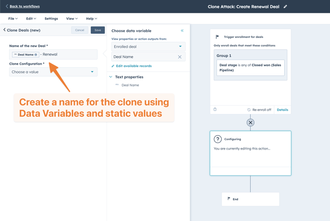 You can set up a workflow to clone a Deal when a renewal is due. With a custom Clone Configuration, you can specify what properties and associations are copied and which values get updated. This allows for tailored automation across different pipeline stages or deal types.